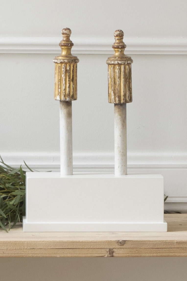 Estacas com terminais esculpidos em madeira entalhada dourada, sob base madeira lacada. By Studio Catherine Cabral Studio