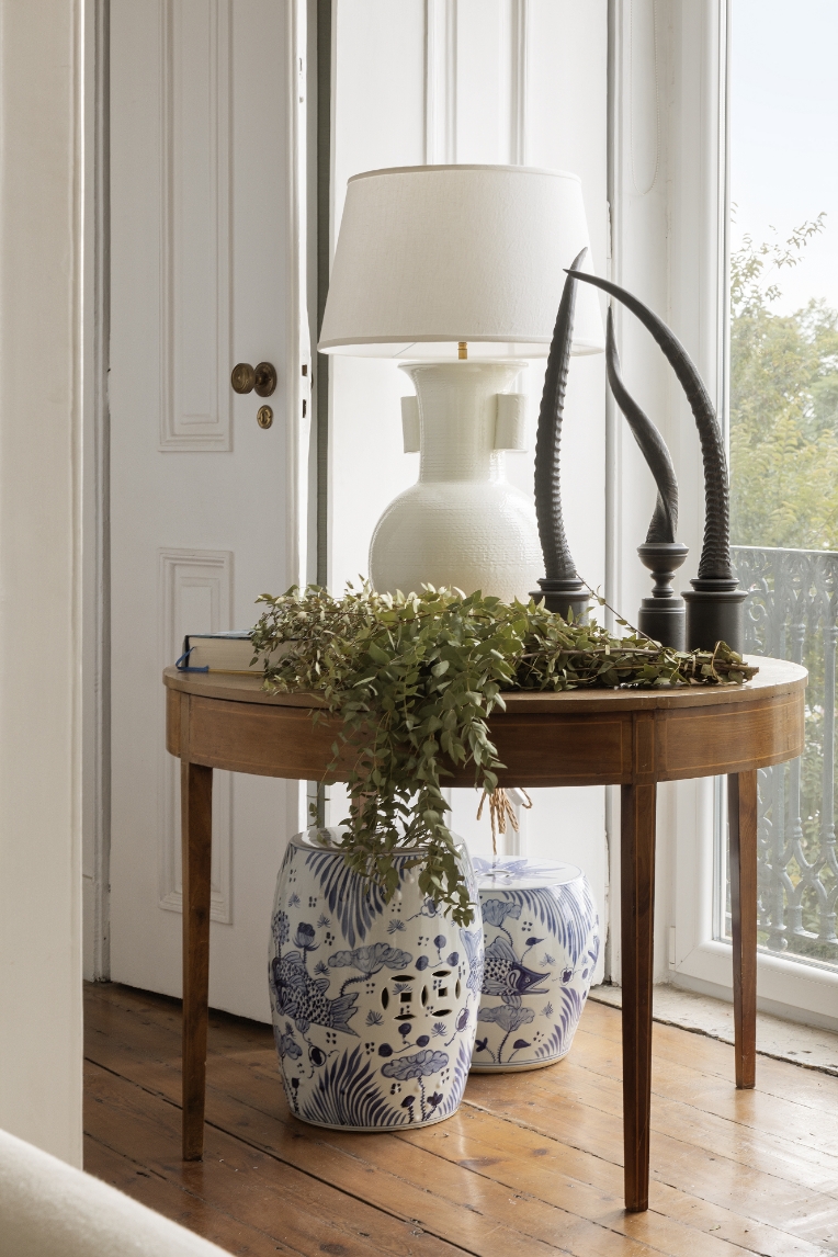 Reprodução de par cornos de gazela em fibra sobre pedestal em madeira