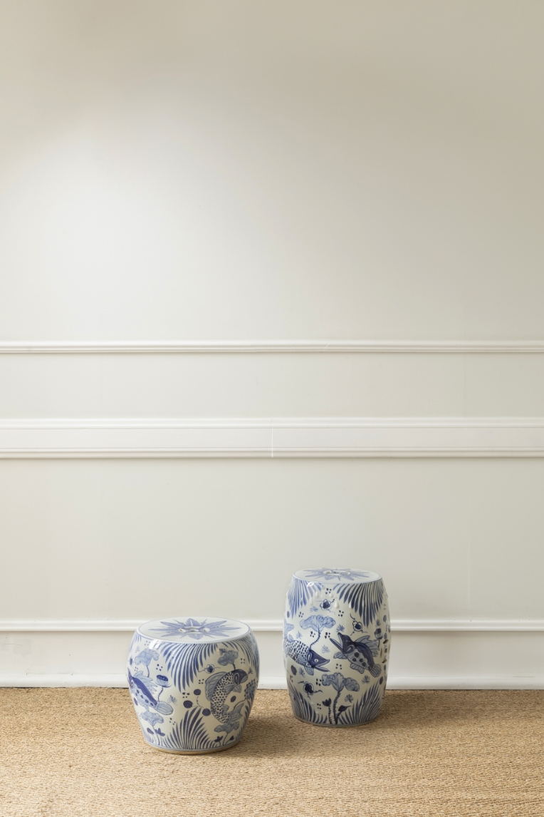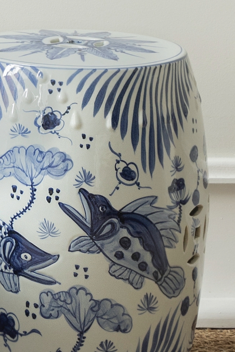 Pequeno stool de apoio, funciona como peça decorativa, mesinha de apoio, repousa pés. Desenho asiático de carpas com elementos marítimos em azul e branco